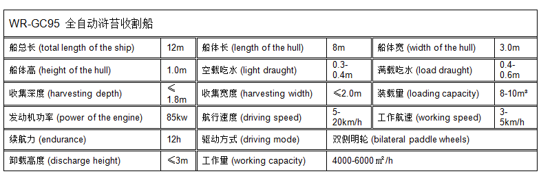 3、该船安装收割底部横刀一副,左右两侧立刀(轮)各一副,机械收集轮一套,既能收割水草也能清理水面漂浮物。
